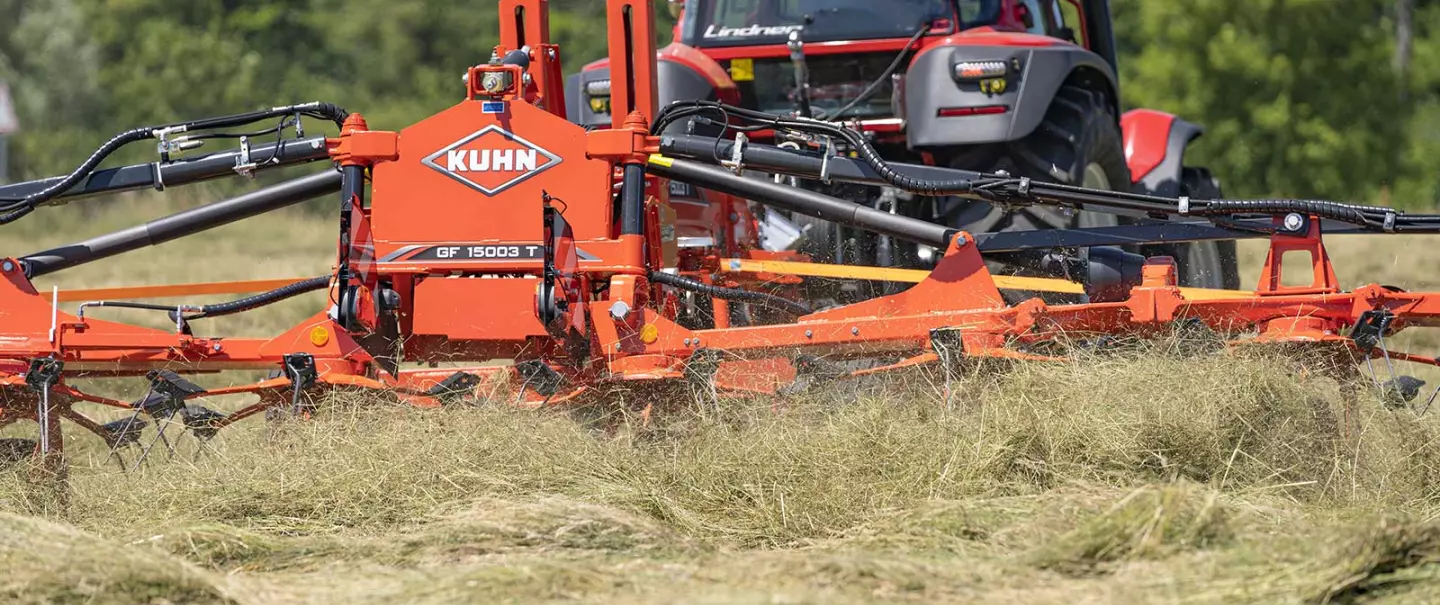 Like their smaller counterparts, the GF 15003 T and GF 17003 T tedders follow the unevenness of the land. For example, the GF 17003 T behaves like an eight-rotor tedder or four four-rotor tedders