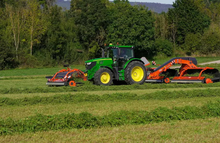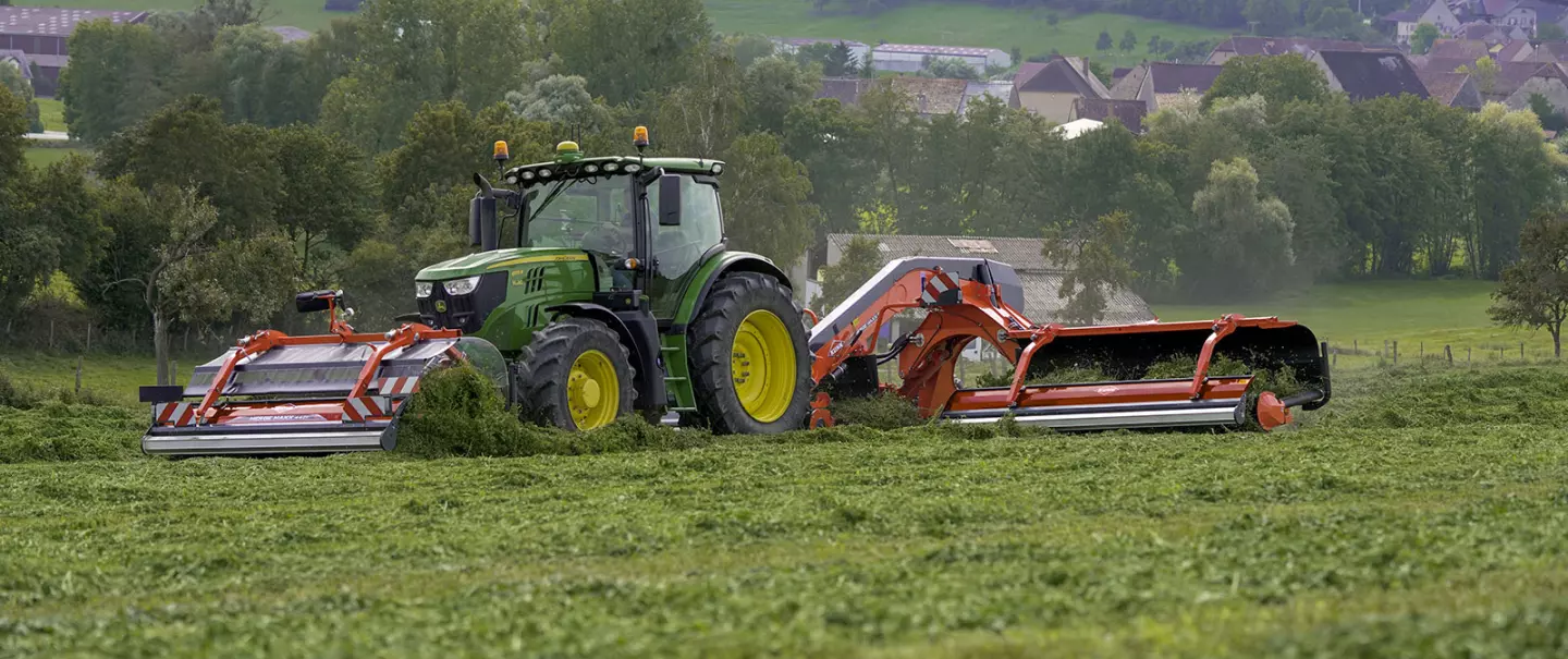 The exclusive double belt on the MERGE MAXX 442 F model allows the user to deliver an equal volume of fodder on each side. This front attachment also prevents the crop from being compacted by the tractor wheels.