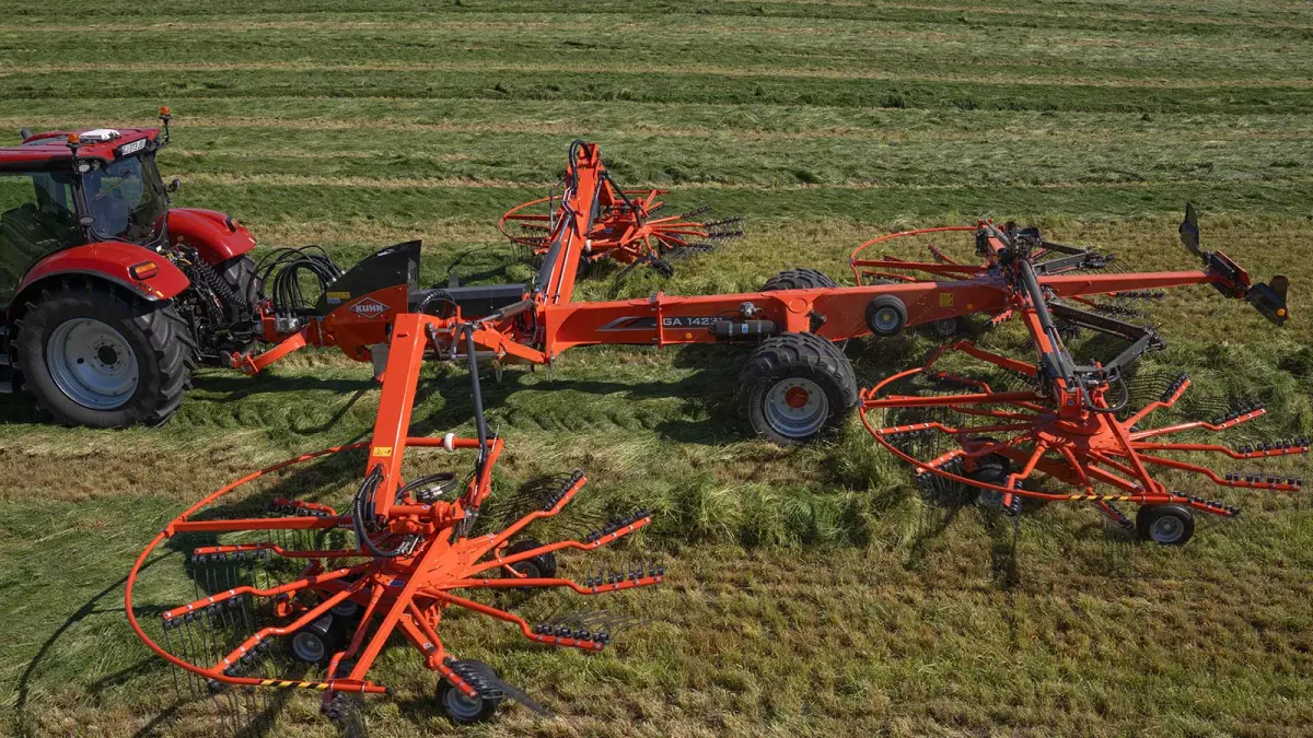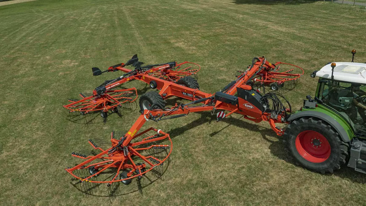 The hydraulic unit of the GA 13231, GA 14231 and GA 15231 rakes is positioned on the swivelling headstock of the machine frame. This ensures that the primary transmission is always perfectly aligned with the tractor, even in tight turns.