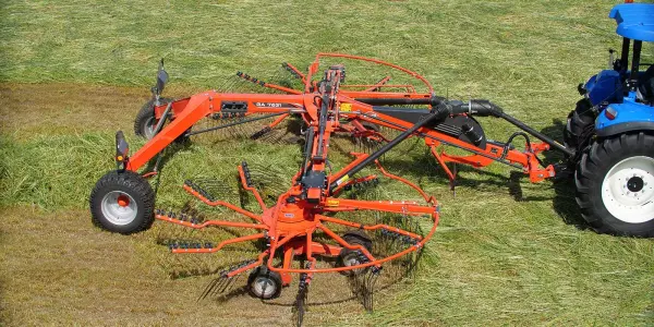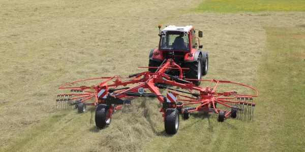 GA 6501 P mounted twin rotor rakes deliver central swaths between 5.65 m and 6.40 m. Their raking quality is impressive and they produce perfect swaths for fast dry-down.