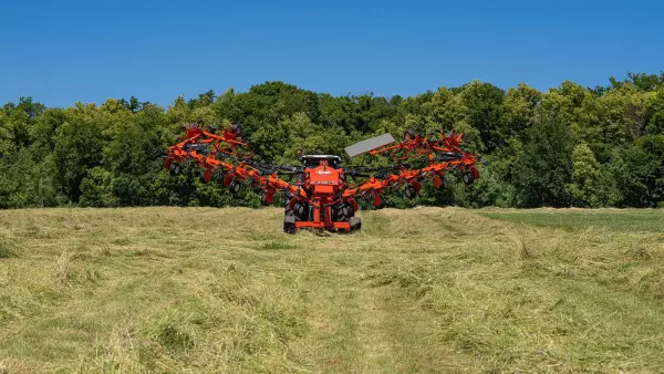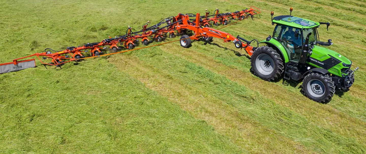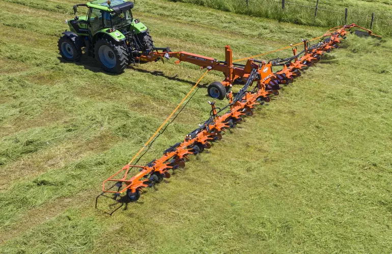 - The small diameter rotors adapt individually to the ground profile and the carrying chassis, ensuring efficient turning over and fast drying of the forage.