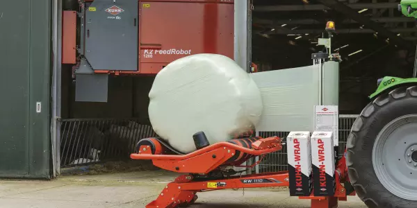 KUHN has an extensive range of round bale wrappers, including three-point linkage mounted models through to advanced trailed units capable of wrapping 100 bales/hour with six layers of film.