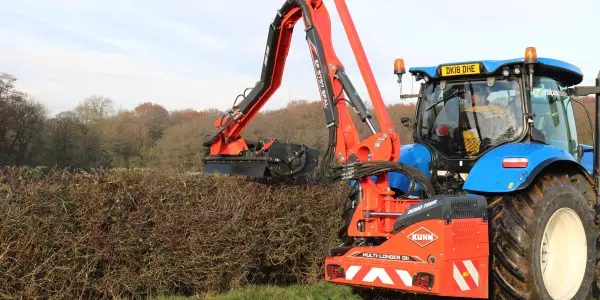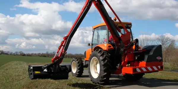 For use up to 100 h/year, KUHN has developed the AGRI-LONGER GII Mechanical Safety Hedge and Grass Cutters with a horizontal reach of 4.30 m or 4.80 m and an available rotor circuit power of 40 hp.