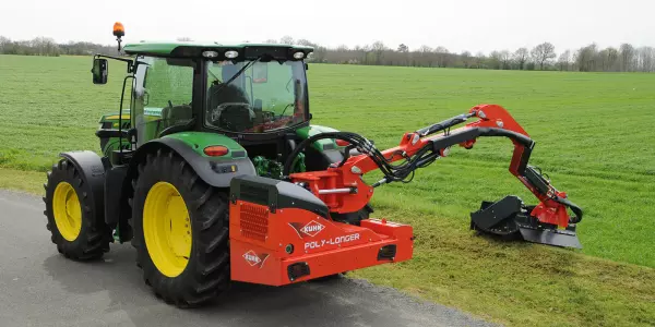For use up to 500 h/year, KUHN has developed the POLY-LONGER hedge and grass cutter models with a horizontal reach of 5 m and an available rotor circuit power of 51 hp.