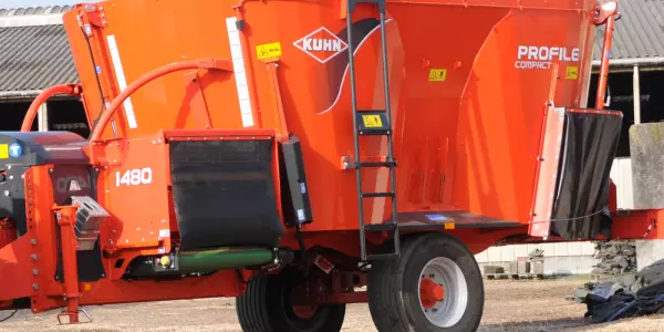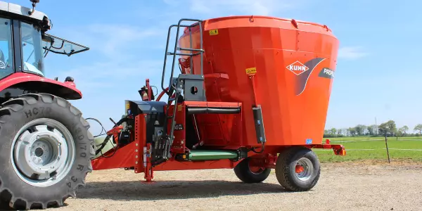 KUHN's trailed single auger mixer wagons with 1 vertical auger suit herds from 20 to 110 dairy cows. These mixers are suitable for smaller livestock farmers looking for a simple and functional machine with direct distribution or by transverse belt and with or without a mulching turbine.