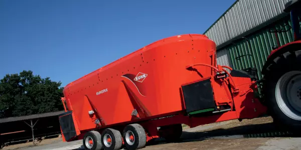 EUROMIX mixer with 3 vertical augers, cross-feeding and large hopper. Available in 28, 33, 39 and 45 m3 capacities, for dairy herds of between 140 and 360 cattle.