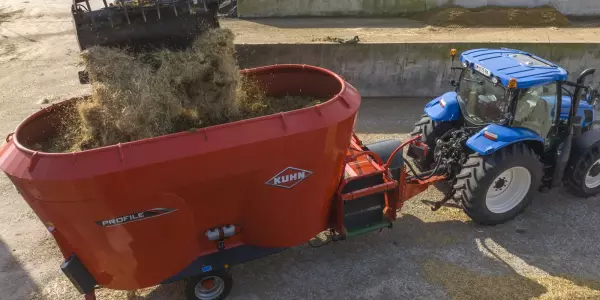 PROFILE PLUS 2 CL mixer wagon with 2 vertical augers, straw-blowing turbine, cross-conveyor distribution and wide tub. Available in 24 to 34 m3 formats, for dairy herds of between 120 and 265 cattle.